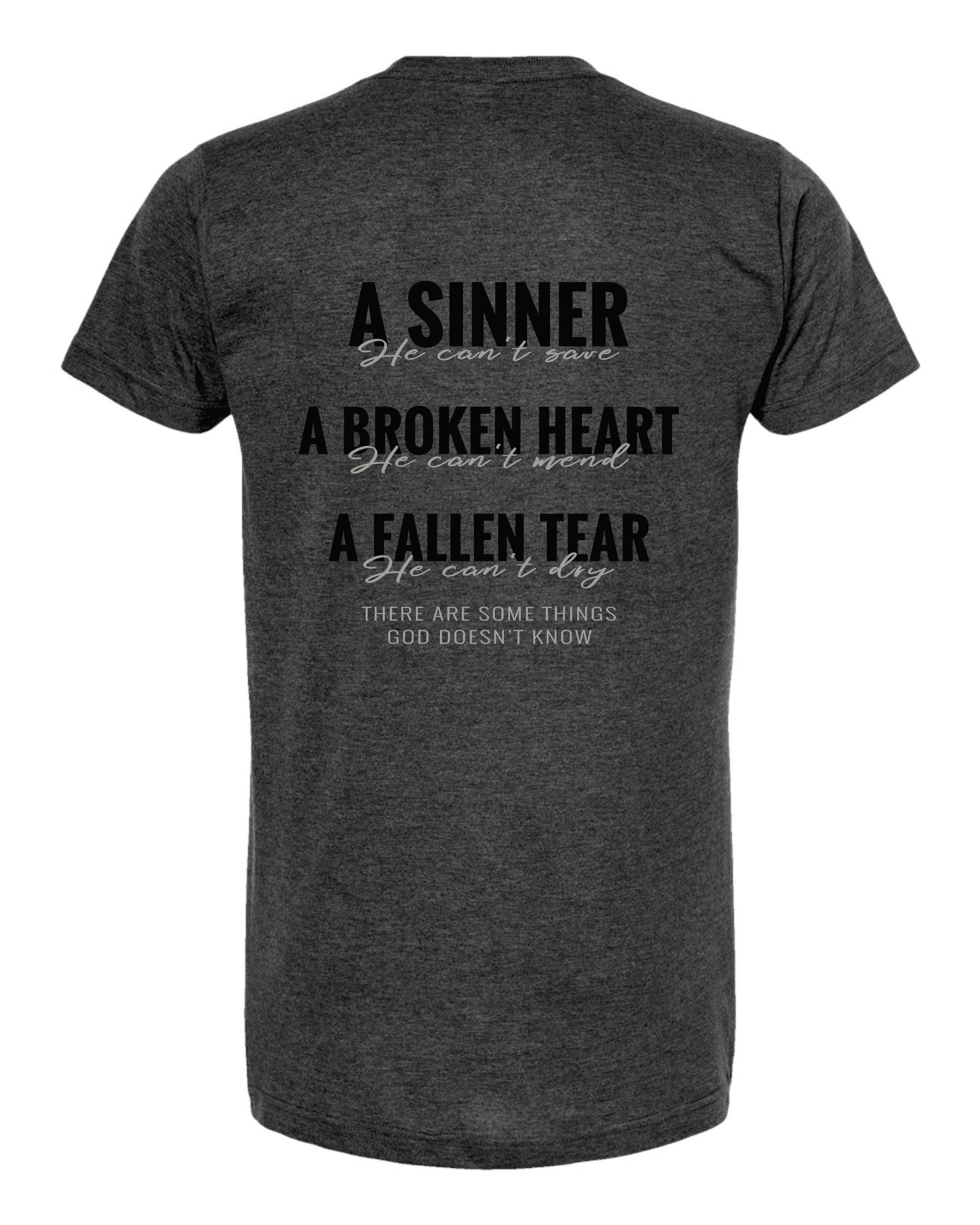Make a statement with the lyrics to Mark's song, God Doesn't Know. This soft, heathered charcoal grey shirt is sure to be a conversation starter to share God's love!