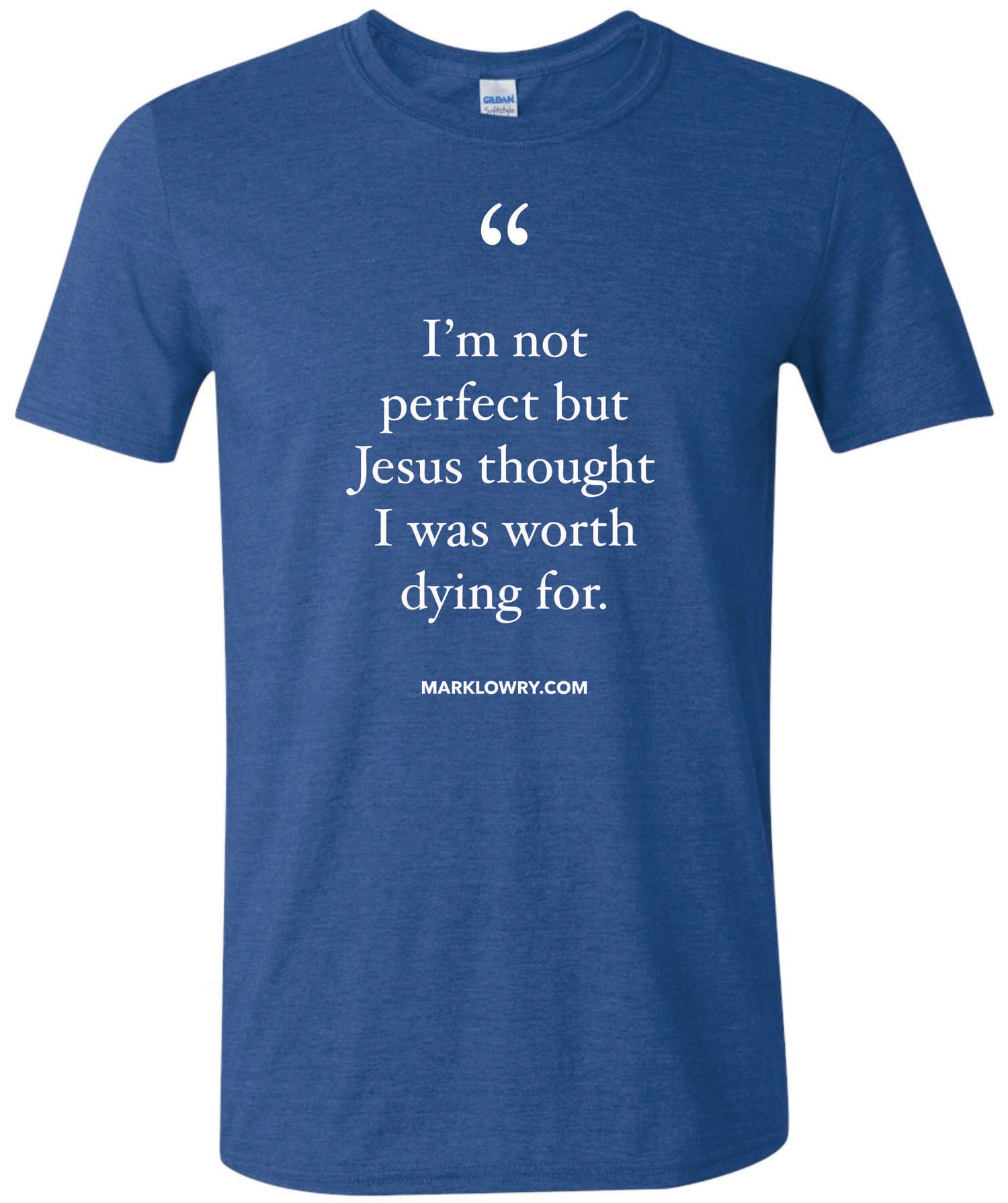 Simple but powerful - this heathered royal blue shirt says “I’m not perfect, but Jesus thought I was worth dying for.”