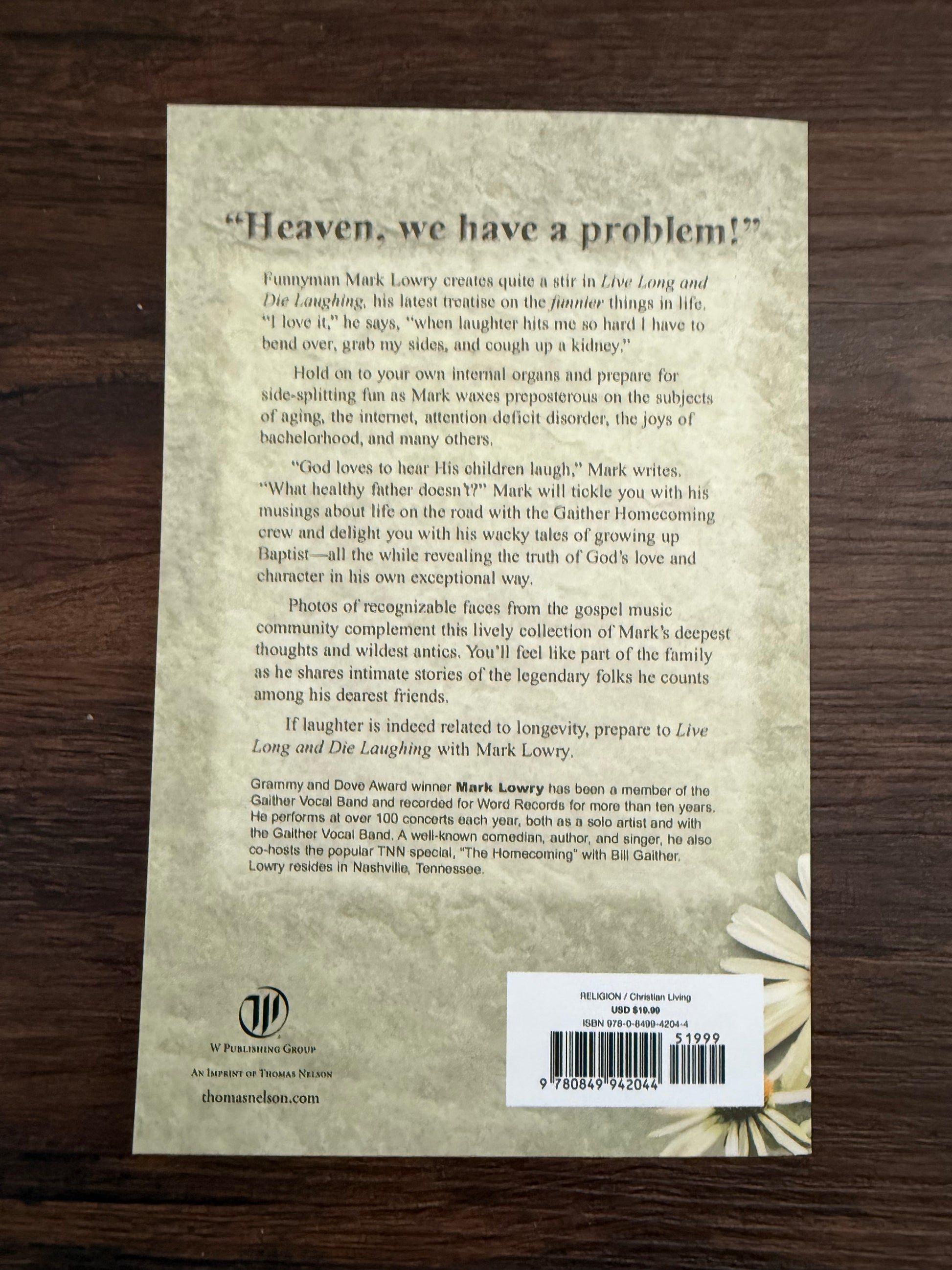 Funnyman Mark Lowry creates quite a stir in Live Long and Die Laughing, his latest treatise on the funnier things in life. "I love it," he says, "when laughter hits me so hard I have to bend over, grab my sides, and cough up a kidney."