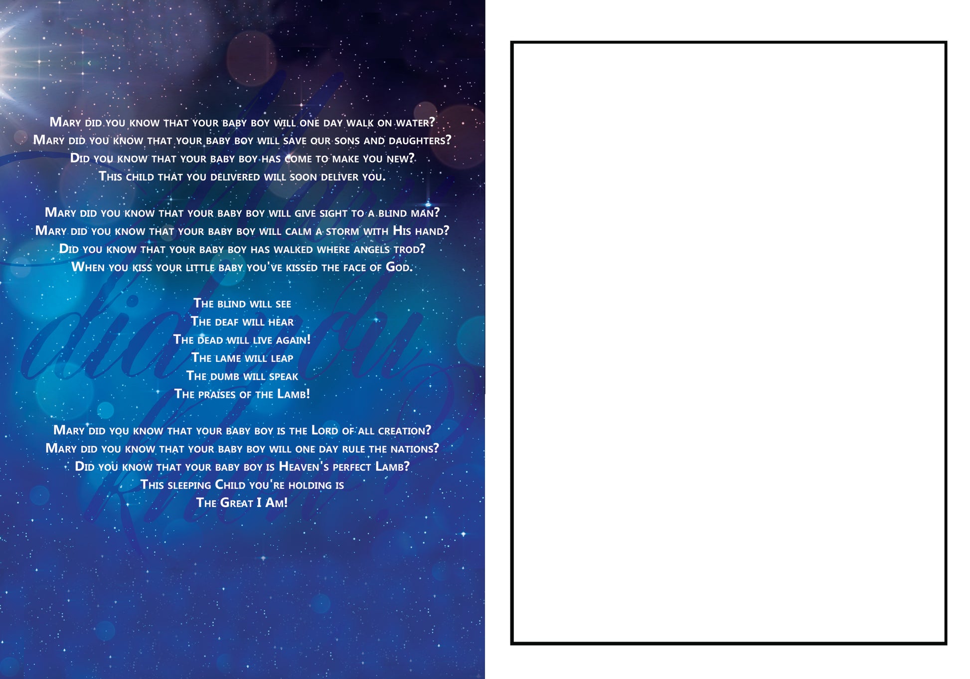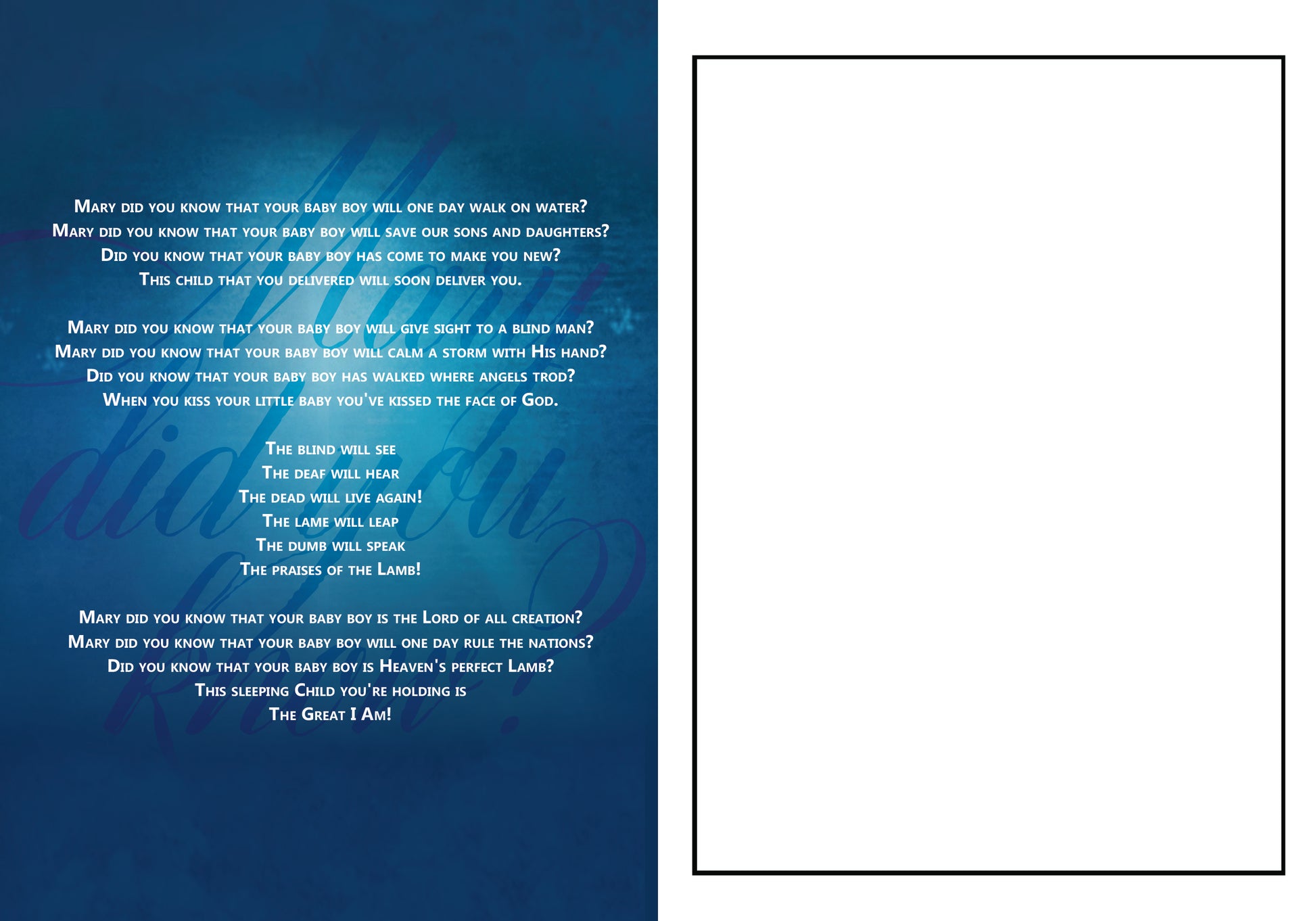 Send your Christmas greetings to friends and family this Christmas with the lyrics to Mary, Did You Know. Two designs are available, each with the lyrics to the beloved holiday classic featured on the inside panel, along with plenty of room to include personal greetings to your loved ones.