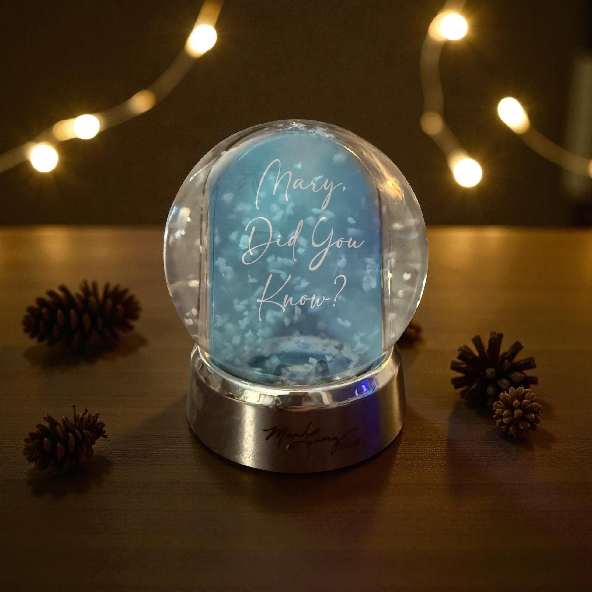 A fun addition to your holiday decor, enjoy this beautiful snow globe featuring a nativity scene and 'Mary, Did You Know' surrounded by snow. The base of the snow globe includes Mark Lowry's signature logo and date.